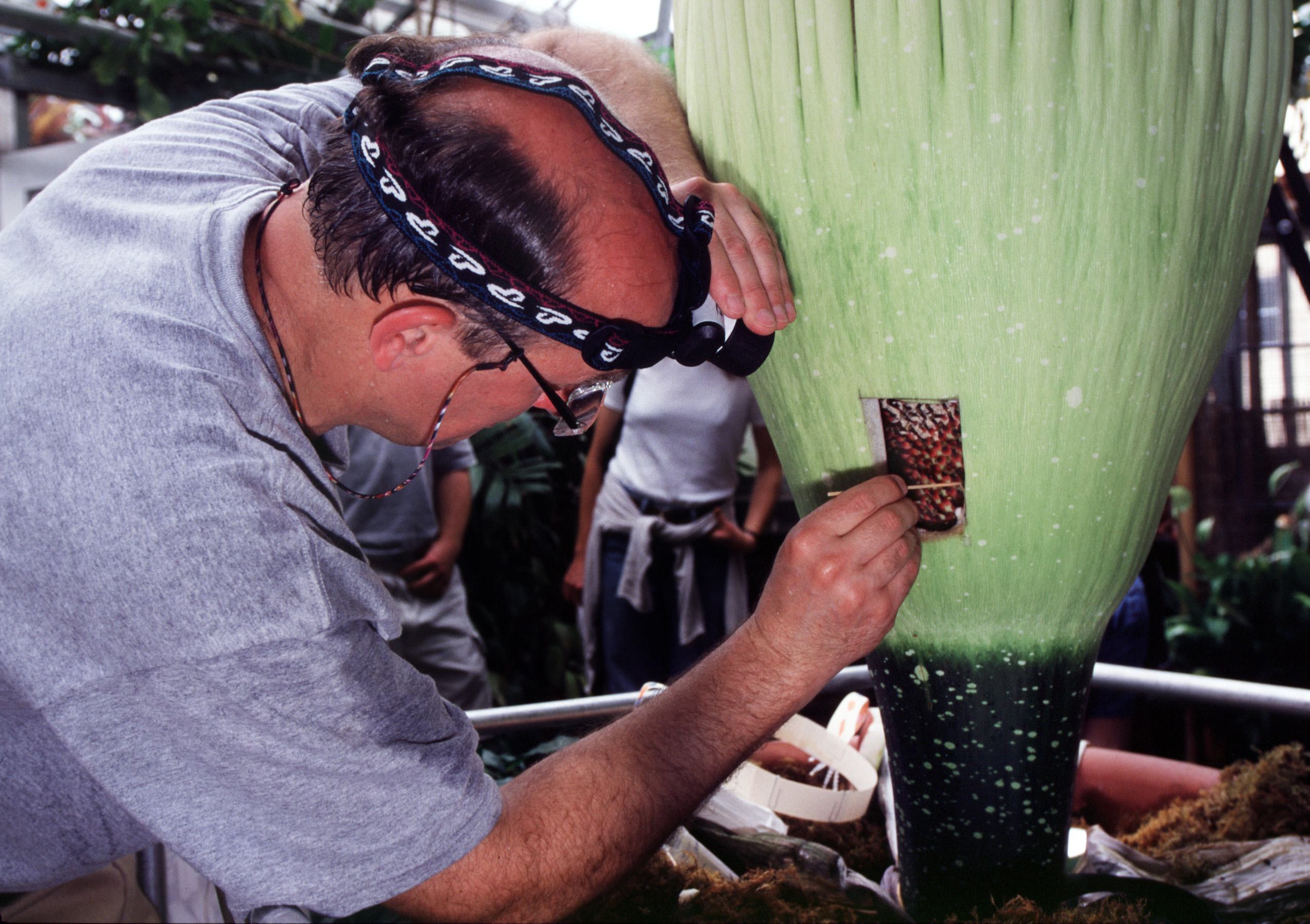 Caption: Paul Berry, director of the UW-Madison Herbarium, holds the pollen prior to applying it to the heads of the female flowers. The pollen was collected from a titan arum that just finished flowering at Selby Botanical Gardens in Sarasota, Fla.