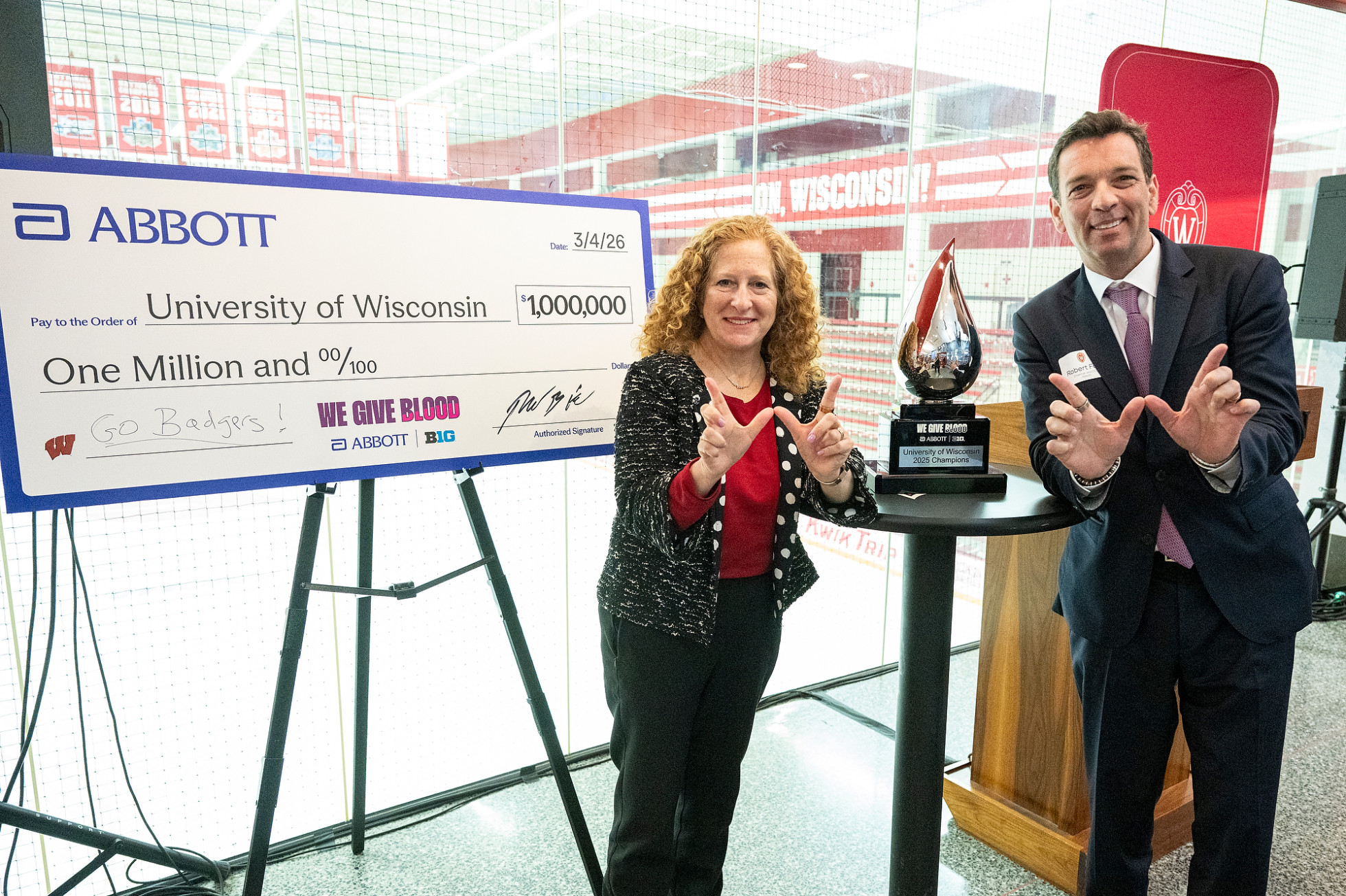 On Wednesday, March 4, leaders from the global health care company Abbott and from the Big Ten Conference made a daylong visit to the University of Wisconsin–Madison to recognize the campus’s first-place finish in their “We Give Blood” competition. UW–Madison accepted the competition trophy and a $1 million award during the Wisconsin men’s basketball game against Maryland at the Kohl Center on Wednesday evening.