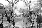 Chaos on campus with National Guardsmen wearing gas masks dispersing tear gas into a crowd of protestors on campus. Photo by John Wolf